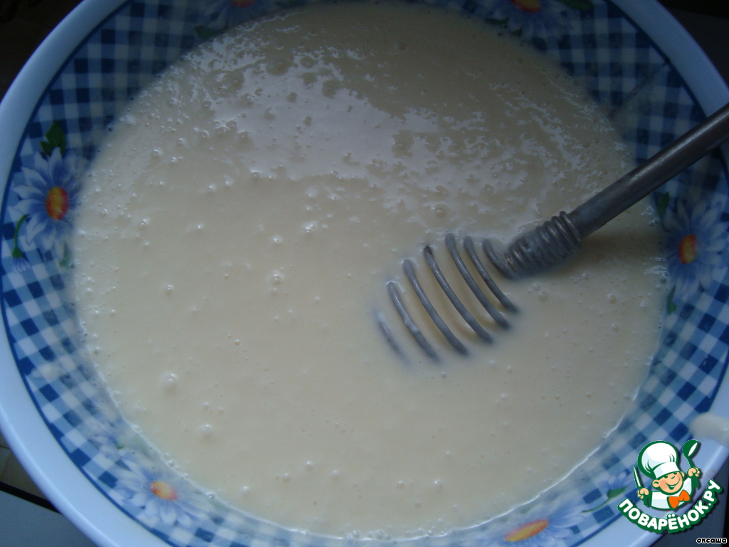 (слова автора) В небольшом количестве воды и 2 чайных ложках сахара развести дрожжи. Дать подняться.