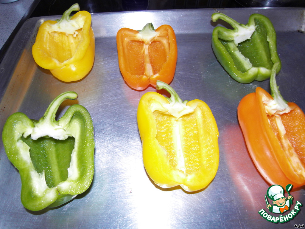 1. Паприку помыть, разрезать пополам, очистить от семян, а хвостик оставим для красоты. Половинки выложить разрезом вверх на противень и выпечь в течении 20 мин при 200 г