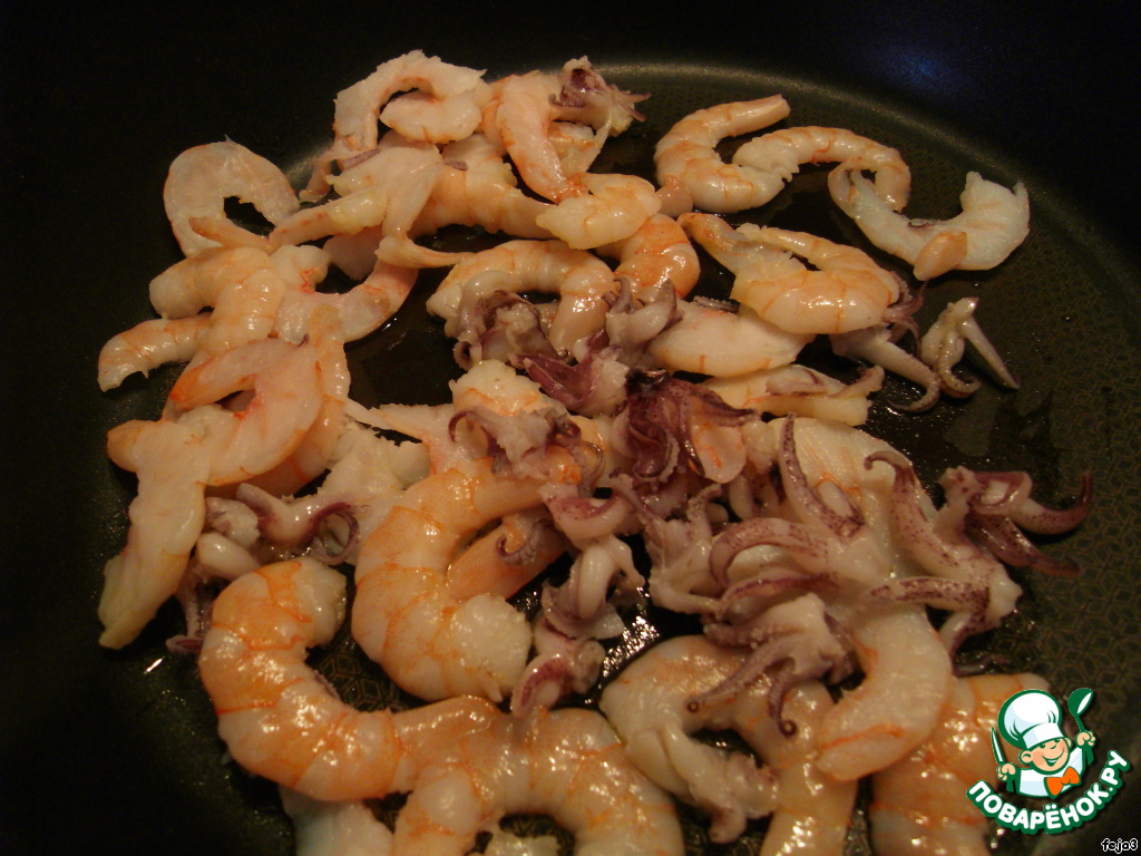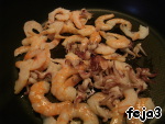 3. Раскалить сковороду с 1 ст.л. оливкового масла. Всыпать морепродукты и обжарить в течении 1 мин.