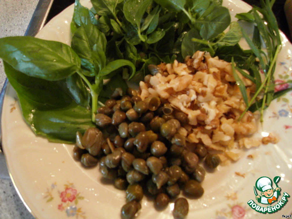 5. Приготовим зелень (порежем ее), измельченные грецкие орехи, каперсы.
