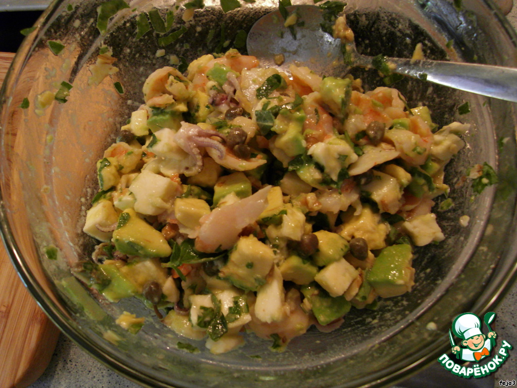 6. Смешаем авокадо, сыр, морепродукты, орехи, каперсы и зелень. Добавим 1-2 ст.л. оливкового масла. Аккуратно перемешаем и начинка для перчиков готова!