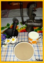 Мясорубкой можно прокрутить хлопья (она у меня антикварная. Из Швеции. Очень тяжелая, начало 60-х годов). Или же воспользоваться ступкой (чугунная).