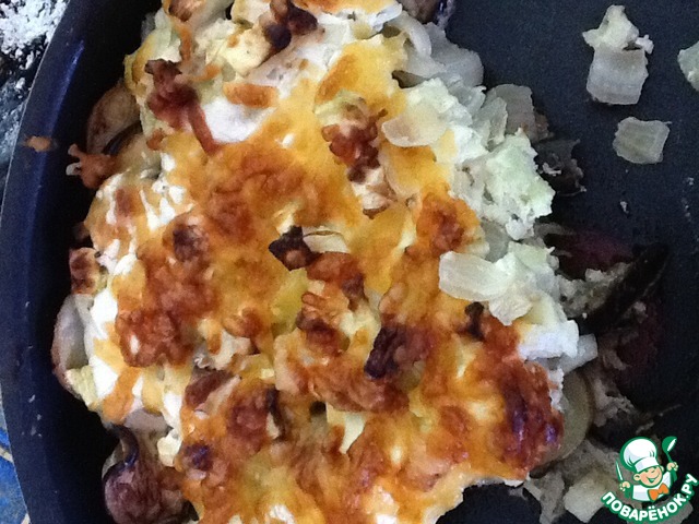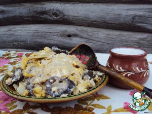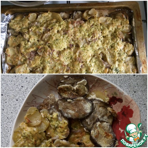 Такое рагу готовила баба Аня исключительно для дорогих гостей или на большие праздники. Овощи резались, посыпались луком и сыром, заливались сметаной и запекались на большом противне в горячей русской печке. Я, конечно же, частенько импровизировала с таким рагу, вместо баклажан добавляла грибы, то покрывала ещe слоем помидор, то посыпала мясным фаршем, только сегодня я ничего не изменила, стараясь воспроизвести приготовление этого рагу в оригинале, единственное - я украсила верх решeткой из майонеза, добавила чуть тeртого чеснока, да и запекала не в печке, а в духовке. И получилось у меня точь в точь блюдо из моего детства - кабачки и сметана придают этому рагу необычайную нежность, баклажаны источают лeгкий вкус грибов (как ни странно), а сыр образует золотистую корочку. Ну, а картофель - это же картофель, в сочетании с другими овощами он приобретает воистину божественный вкус!