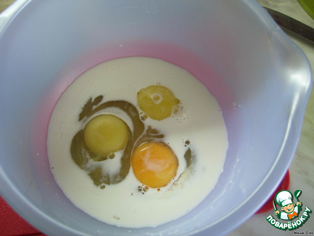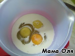 В ёмкость для взбивания выливаем яйца (у меня были мелкие, поэтому я взяла 3 штуки) и добавляем молоко.