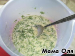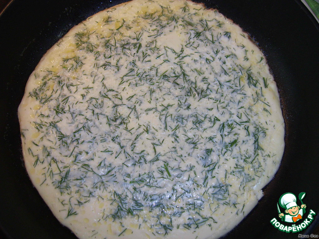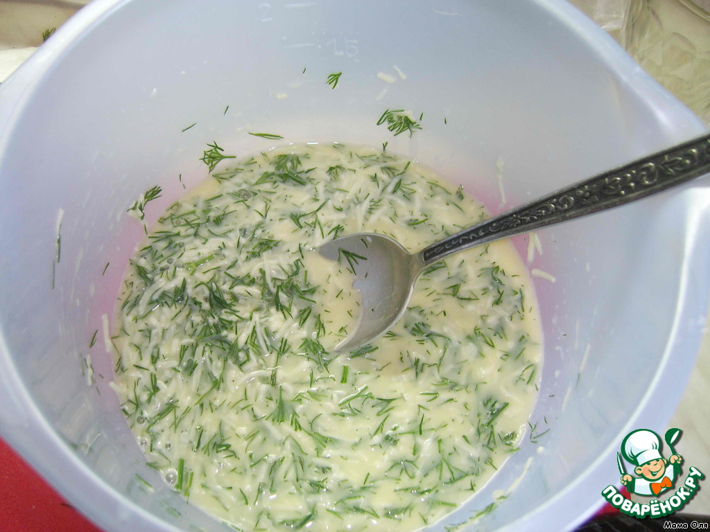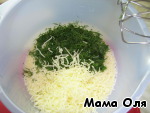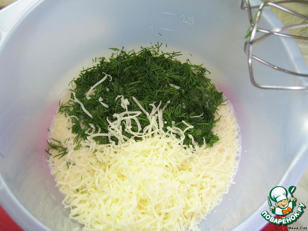 Взбиваем яйца с молоком и добавляем к яичной массе тёртый на крупной тёрке сыр и мелкопорезанный укроп.