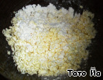 Просеем муку. Добавим в нее наструганное замороженное масло.