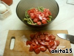 2. Остывшую отваренную фасоль кладем в салатник. Помидоры нарезаем довольно крупным кубиком и убираем с них лишнюю жидкость и семечки.