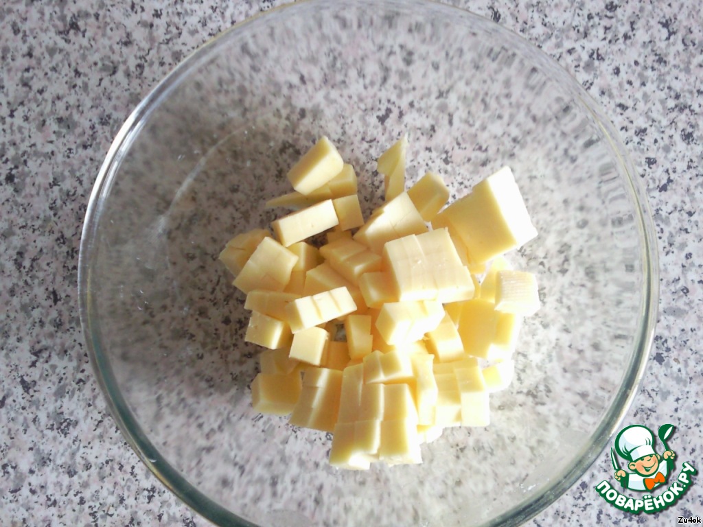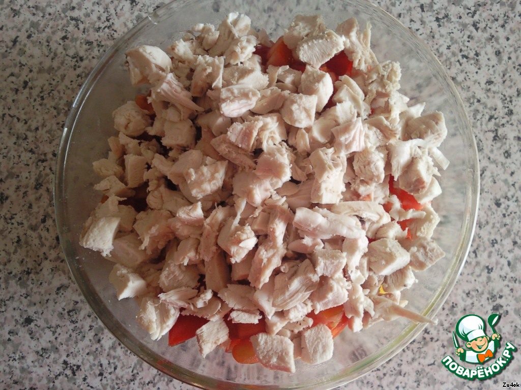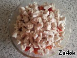 Как только будет готова грудка, нарезать ее кубиками.