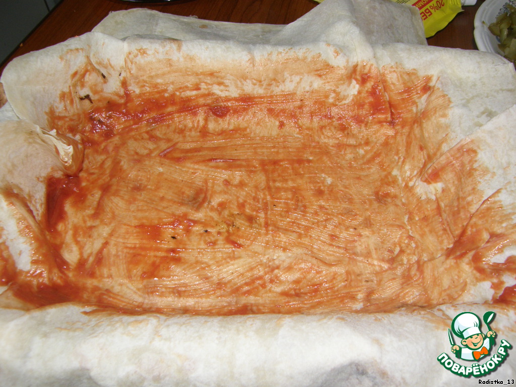 Форму застелить бумагой для выпекания, выложить развернутый лист лаваша и немного смазать его майонезом в центре, второй лист положить крест накрест и смазать кетчупом.