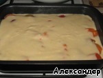 Из кефира, сахара, мягкого масла, яиц и муки замешиваем тесто. Оно должно быть как на густые оладьи. Соду уксусом гасить не надо - в тесте кефир. Выливаем в форму чуть больше половины теста.