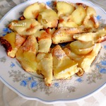 Смазать сковороду сливочным маслом (она у меня небольшая, поэтому полученную массу я делила на две части), выкладываем равномерно массу и сверху ломтики яблок. Ещe добавляют распаренный изюм, но это на любителя, я не добавляла.