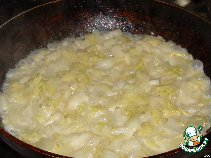 Выключить огонь под капустой и залить капусту яичной болтушкой -