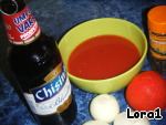 Залить томатным соком так, чтоб только покрыло куски мяса. Воду не добавлять!!!