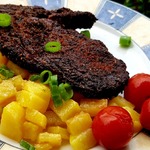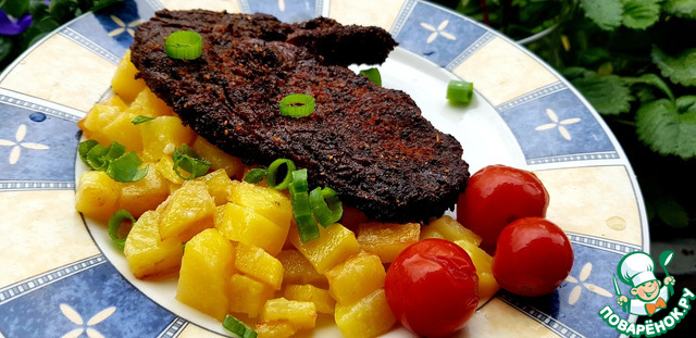 2. Насыпать на мелкую тарелку 1 ч л. молотого чeрного перца и горошины зелeного перца. Стейки одной стороной прижать к перцу и обжарить в 2 ст. л. масла по 4 минуты с каждой стороны. Посолить.