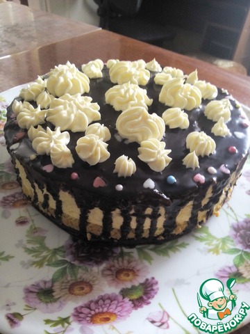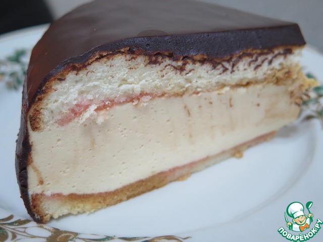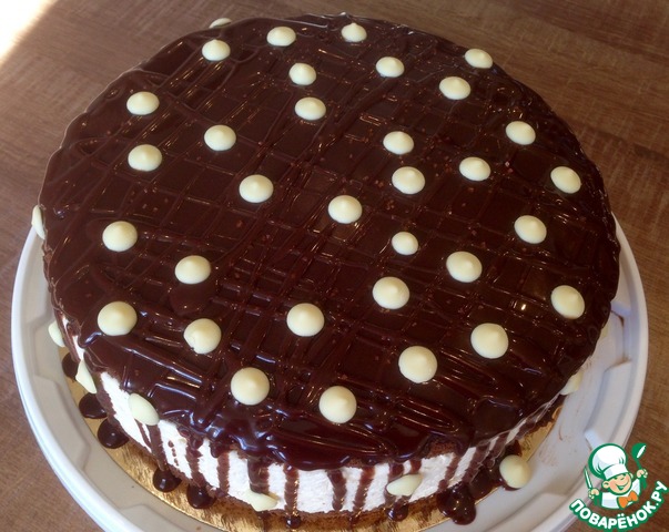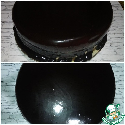 Когда торт полностью застынет, кольцо убрать и покрыть торт шоколадной глазурью. Я уже очень спешила, поэтому не было времени фотографировать этот этап. Глазури у меня получилось маловато, покрыла только верх, но, вообще-то, надо покрывать и бока тоже. Торт можно даже и не украшать вовсе, он сам по себе самодостаточен.