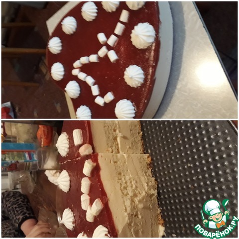 Выложить наш потрясающий крем, разровнять и накрыть вторым коржом. Слегка прижать. Убрать в холодильник до полного застывания, лучше всего на ночь.