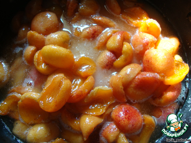 На утро выделяется сок. Кастрюлю поставить на огонь и варить сначала на сильном огне до растворения сахара, а потом снизить огонь и варить на медленном огне около часа. Помешивать и следить, чтобы фрукты не пригорели.