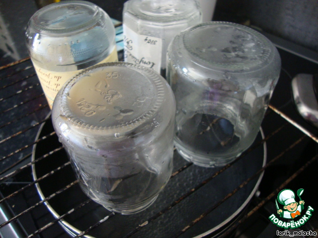 В это время стерилизуем баночки. Я ставлю решетку на кастрюлю с кипящей водой, на нее - баночки и жду 5 минут. Готово. -
