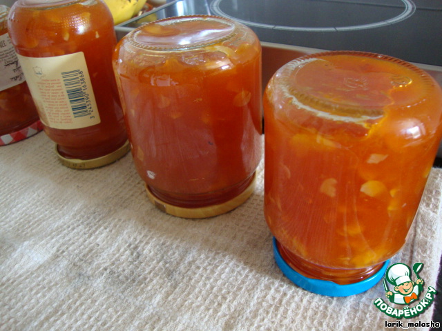 Еще горячим разложить варенье в стерилизованные баночки. Закрыть крышкой (я взяла обычные завинчивающие крышки). И сразу перевернуть вверх дном. Таким образом образуется что-то типа вакуума, и варенье будет стоять долго и не портиться, даже если мы не делаем закатку.