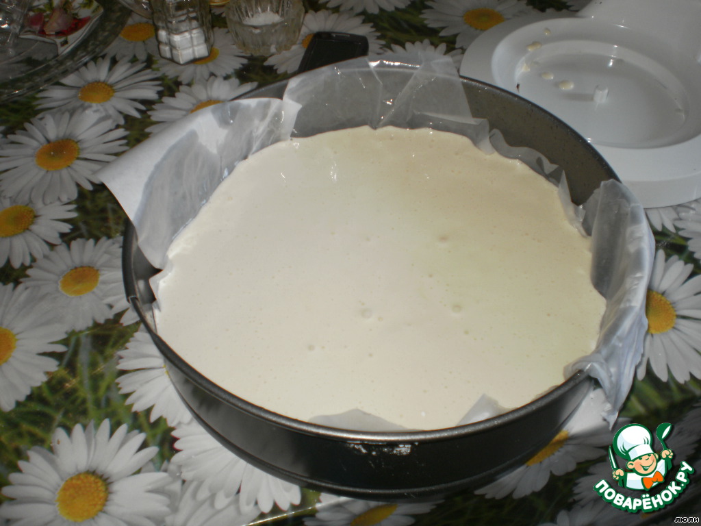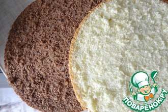Тесто выложить в форму и выпекать 25 мин. при 200 градусах. Корж разрезать на 2 коржа.