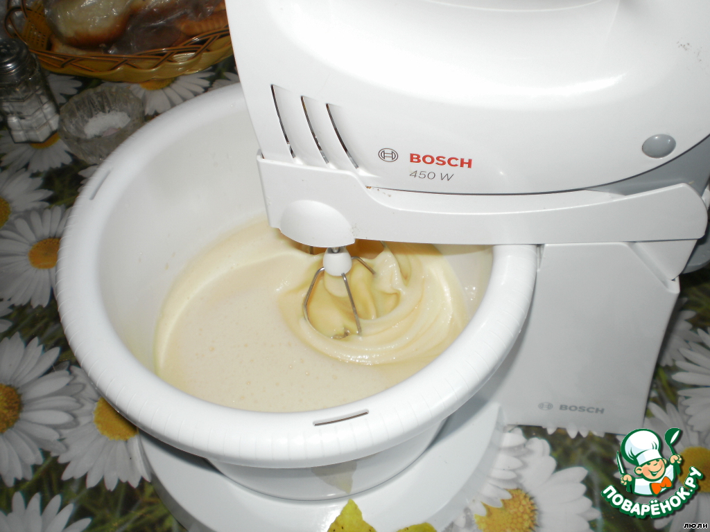 Яйца взбить с сахаром, ванильным сахаром, добавить просеянную муку, крахмал, разрыхлитель, всыпать в яичную смесь, перемешать.