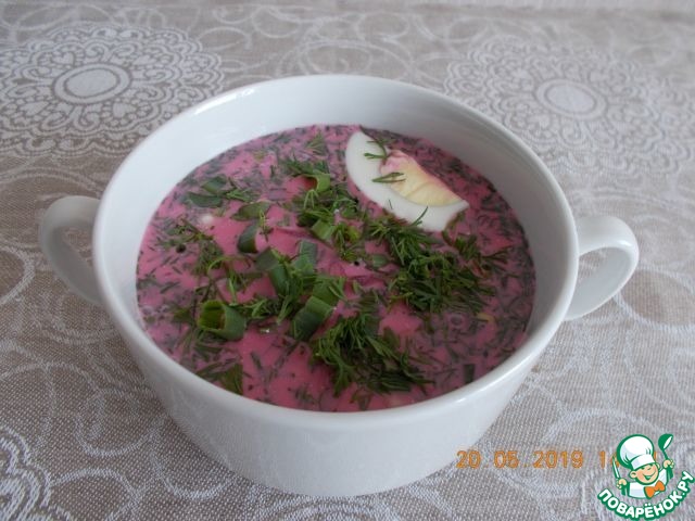 Волею судеб я родилась и выросла в Литве. И это, естественно, наложило свой отпечаток. Поэтому совершенно не ем и тем более не люблю готовить окрошку, а вот литовский холодный борщ - с большим удовольствием))). И теперь даже муж забыл про окрошку и просит холодного борща. Именно такой холодный борщ подают во всех закусочных и кафе Литвы. Там даже продают специальный кефир для холодного борща.