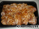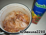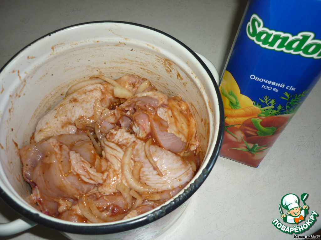 • Курицу порезать порционными кусочками, посолить, добавить специи и соевый соус. Лук порезать полукольцами, выложить к курице и залить овощным соком. Дать постоять 2 часа, чтобы промариновалось мясо.