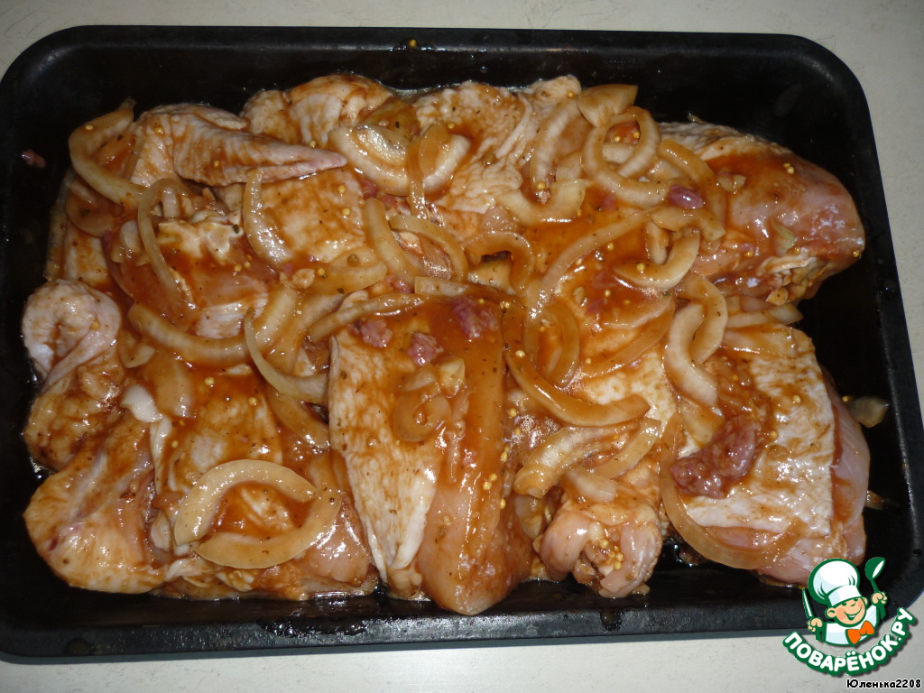 • После того, как мясо промариновалось (для пикника лучше брать ноги и мариновать всю ночь), выложить на противень с высокими бортиками,предварительно смазанный маслом. Жидкость, которая остается, добавлять к мясу не нужно, чтобы оно не плавало.