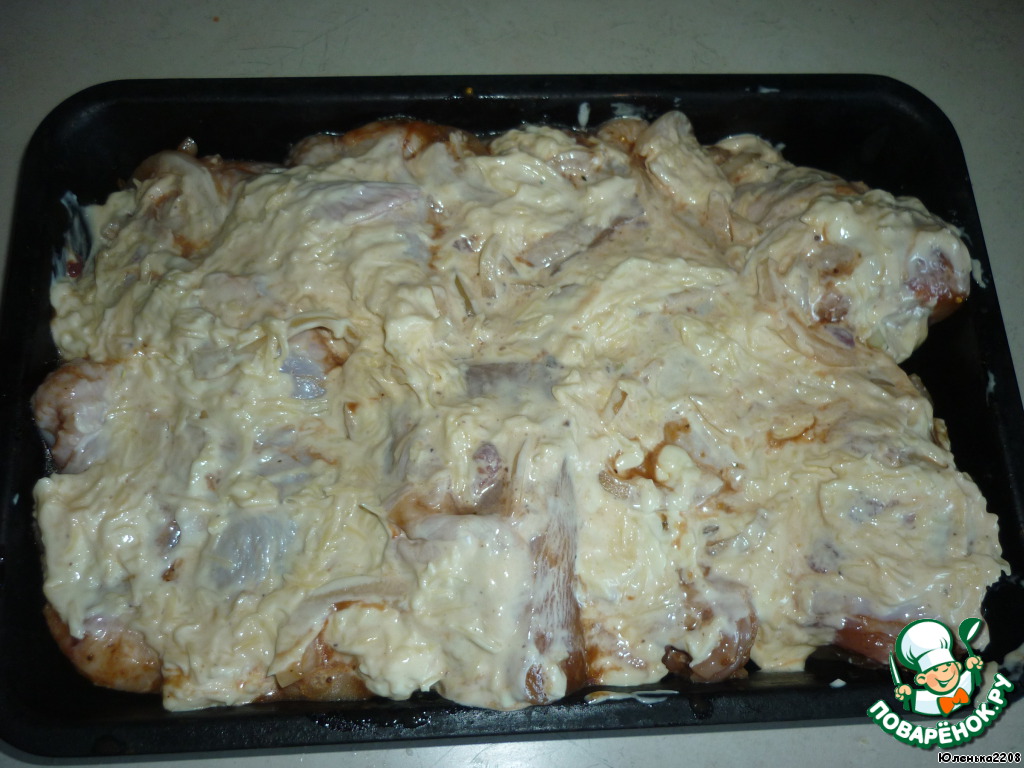 • Для пикника мясо в таком виде жарится на решетке, а дома мы сыр натертый на терке смешиваем с майонезом и смазываем мяско. Ставим в духовку 200 градусов до появления румяной корочки.