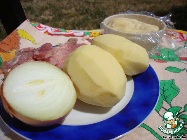 Для начинки нам понадобится картофель, лук и свинина. -