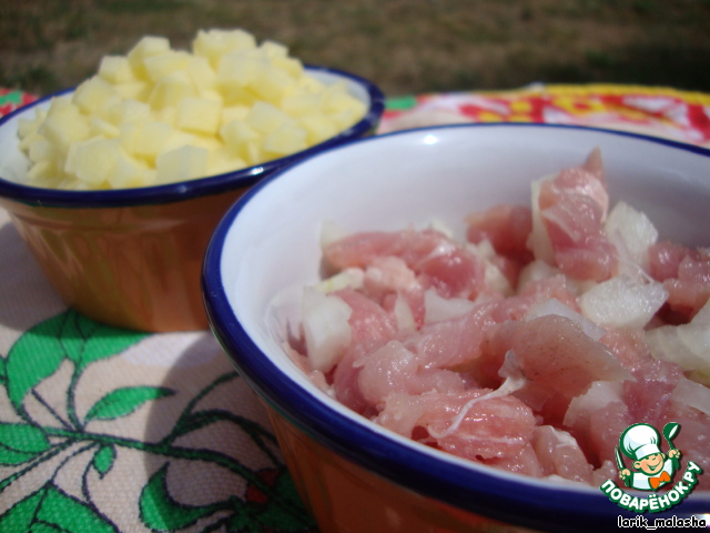 Сырой картофель нарезаем маленьким кубиком, также как и мясо с луком. Свинину перемешаем с луком. Обе начинки посолим и поперчим.