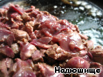 Моем куриную печень и режем кусочками. Поджариваем на сковородке до полуготовности.