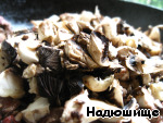 Режем грибы и добавляем к печенке.