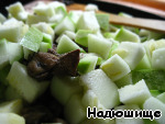 Кабачок нужно порезать кубиками и тоже бросить в сковородку.