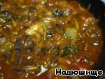 И в конце готовки, когда все ингредиенты уже съедобны, добавляем томатный соус. Тушим еще минут 5.
