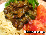 Спагетти с куриной печенью и овощами