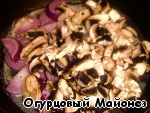 Тем временем начинаем готовить зажарку из красного лука и нарезанных шампиньонов. Лук должен быть нарезан крупными полукольцами, шампиньоны режутся мелко, а для жарки мы используем сливочное масло. Солим и перчим по вкусу.