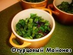 На дно каждой маленькой кастрюльки кладём чайную ложку сметаны.