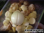 Лук 1/2 порции, сердцевину цукини, баклажан и помидоров(1/2)