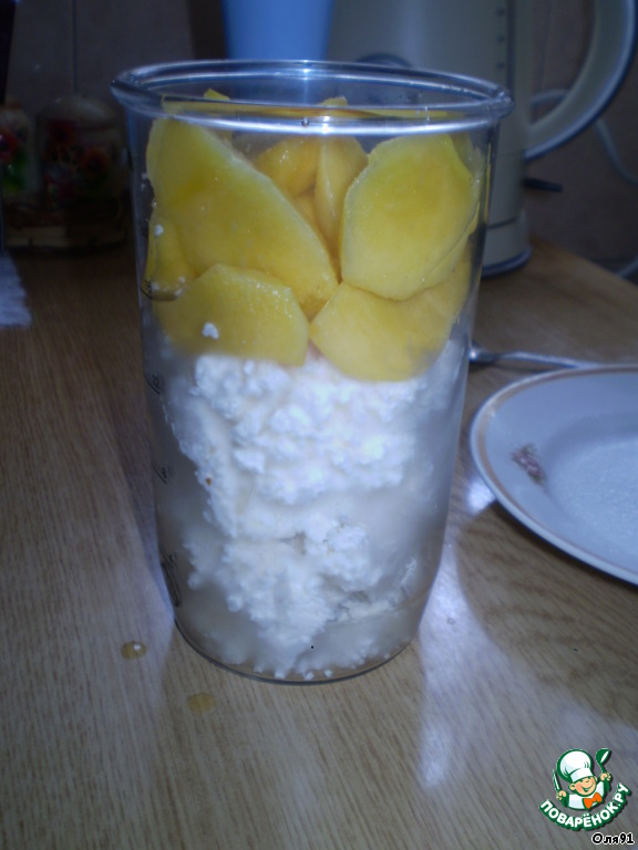 Кладём в блендер, к нему нарезаем 2 очищенных от шкурки персика и хорошенько взбиваем -