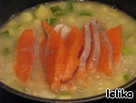 Выкладываем рыбу из бульона и пару столовых ложек картофеля и кабачков для украшения блюда.
