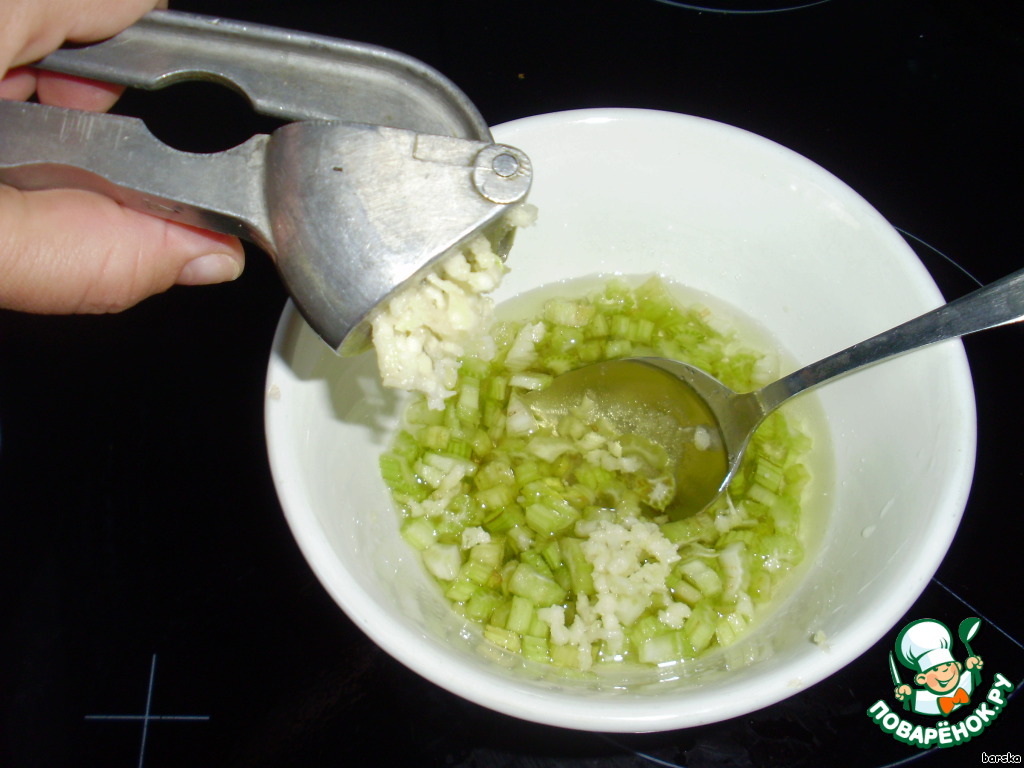 Стебли черешкового сельдерея мелко нарезать, добавить уксус, сахар, соль, перец, измельчённый чеснок, перемешать, а через 10 минут добавить растительное масло.