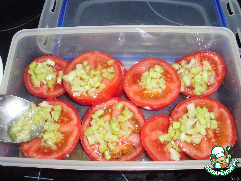 Помидоры нарезать толстыми кружочками (1 помидор - на 3 кружочка), выложить в пластмассовую ёмкость с крышкой для дальнейшего маринования в холодильнике. На каждый кружок помидора выложить сельдерейную массу (слоёв может быть несколько).