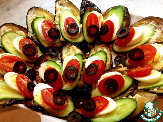На него кладем тоненький овальчик огурчика. На большой ломтик баклажана - большой огурчик, на маленький - маленький.