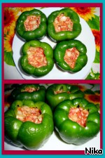 Заполнить перцы фаршем - мясной фарш, 1/2 луковицы, 1/2 тёртой моркови, чёрный перец, соль, вода 100 гр.