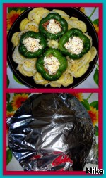 Сверху перцев и картофеля посыпать приправой к мясу. Верх закрыть фольгой и поставить в духовку при температуре 200 градусов на 25-30 минут.