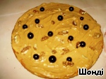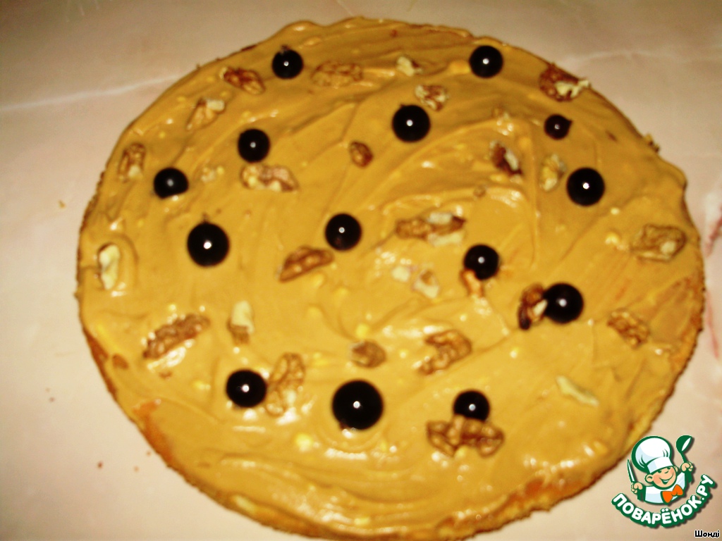 Смазываем коржи кремом, на прослойку укладываем ягоды смородины и грецкие орехи.