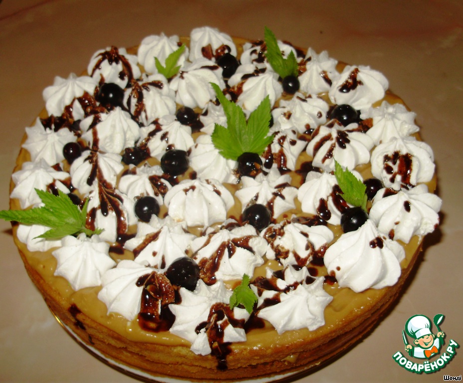 Украшаем торт меренгами и ягодами смородины.