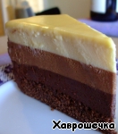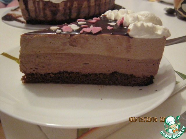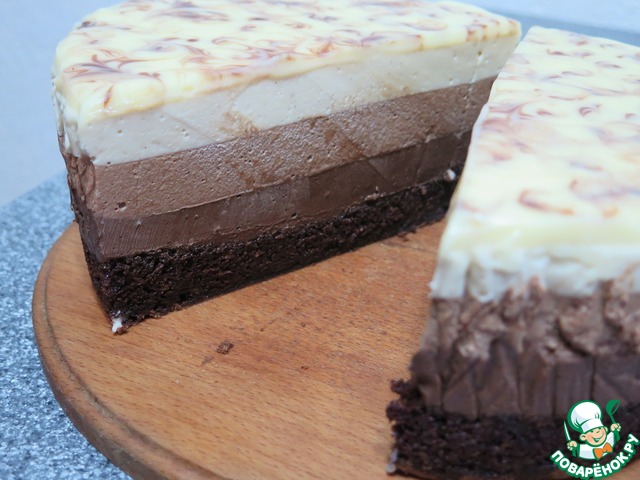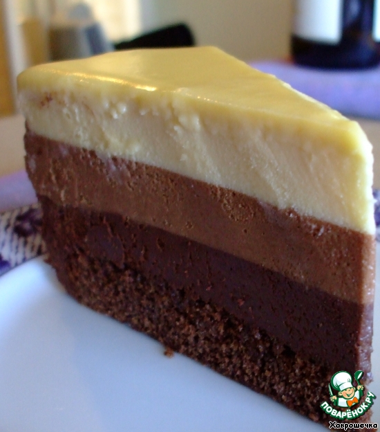 По аналогии готовим мусс из молочного шоколада и выливаем его поверх подстывшего черного. И снова в морозилку.