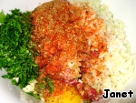 Фарш соединить с зеленью, чесноком, яйцом, луком, солью морской и специями.